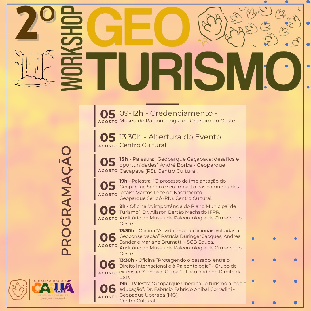 Estão todos convidados para o 2º Workshop de Geoturismo em Cruzeiro do Oeste, que acontecerá nos dias 05 e 06 de agosto. Teremos uma programação completa com temas sobre turismo, geoparque, desenvolvimento econômico, palestras, oficinas e muito mais! Um evento organizado pela Secretaria Municipal de Desenvolvimento Econômico e Turismo, em parceria com a Secretaria Estadual de Turismo do Paraná, CNPq, UEM, SGB e Instituto Água e Terra.