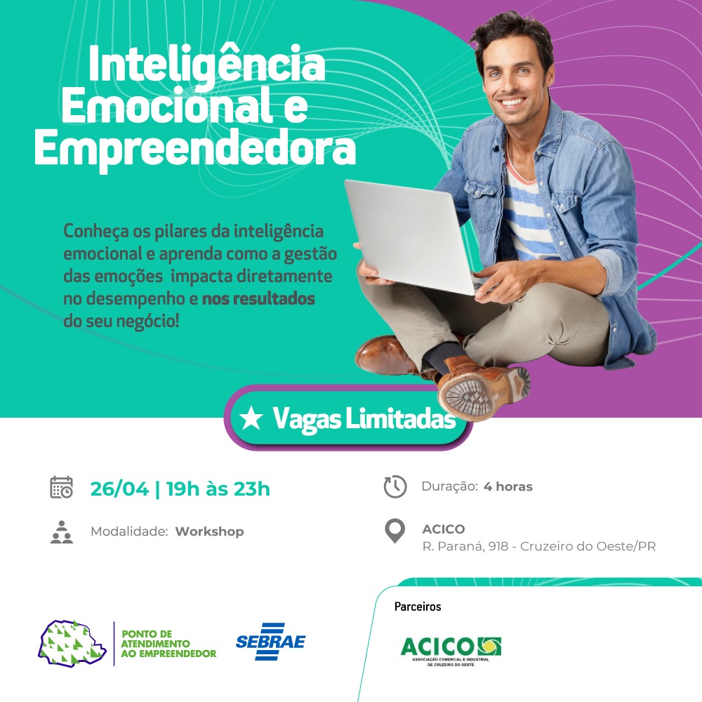 A ACICO em Parceria com o Ponto de Atendimento ao Empreendedor - PA do Sebrae, realizará no dia 26/04 com início as 19:00, na sede da Associação a palestra Inteligência Emocional e Empreendedora. Faça sua inscrição pelo