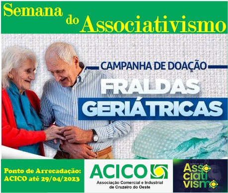 Entre os dias 24 a 29 de abril, as associações comerciais em parceria com a Cacier, Caciopar e FACIAP desenvolvem ações alusivas à Semana do Associativismo. O associativismo é a união de pessoas que, além de gerar emprego e desenvolvimento, trabalham pela prosperidade de sua comunidade. Nesse sentido, a ACICO está desenvolvendo uma campanha de doação de Fraldas Geriátricas. Faça sua doação, podendo ser em dinheiro (que será utilizado para compra de fraldas) ou em fraldas, as mesmas serão doadas para a Pastoral Social da Paróquia Nossa Senhora de Fátima. #semanadoassociativismo