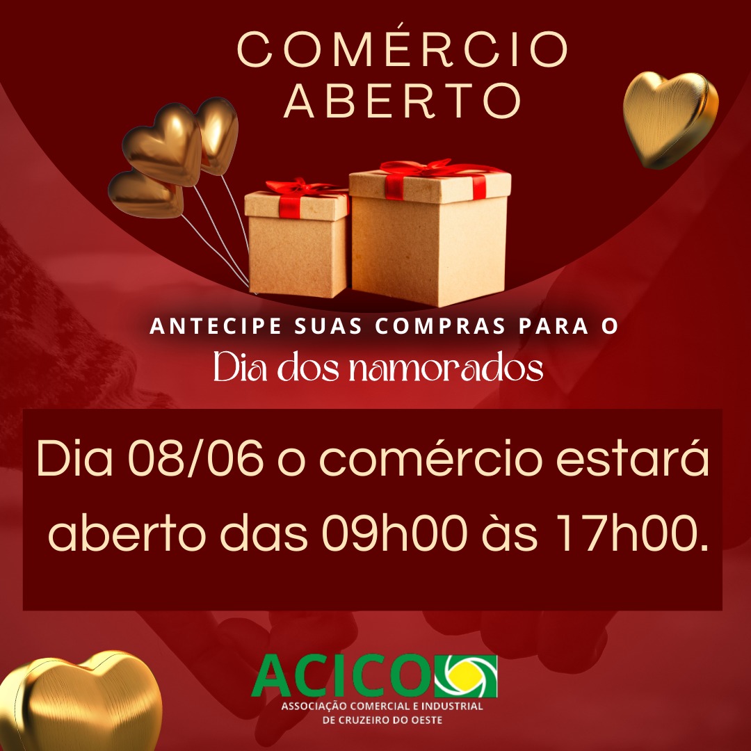 ACICO COMÉRCIO ABERTO !!! APROVEITE O HORÁRIO ESTENDIDO, PRESTIGIE O COMÉRCIO LOCAL. Postado em 05/06/2024 às 13:13 | Atualizado em 05/06/2024 às 13:20 Postado em 05/06/2024 às 13:13 | Atualizado em 05/06/2024 às 13:20