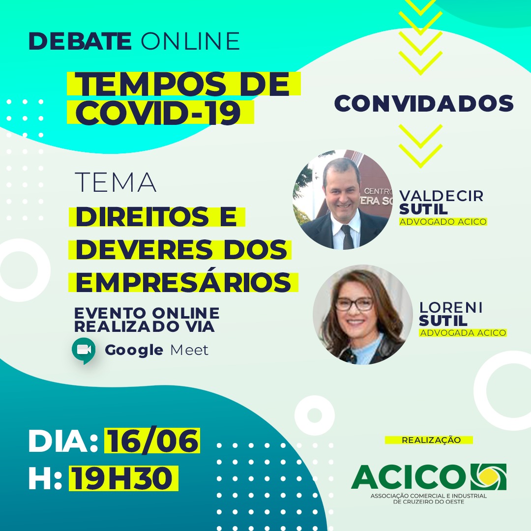 Na próxima terça-feira (16) as 19h30m a ACICO irá realizar um debate online com o juridico da entidade,na qual o tema é "DIREITOS E DEVERES DOS EMPRESÁRIOS EM TEMPOS DE COVID 19".O debate será realizado via Google Meet.