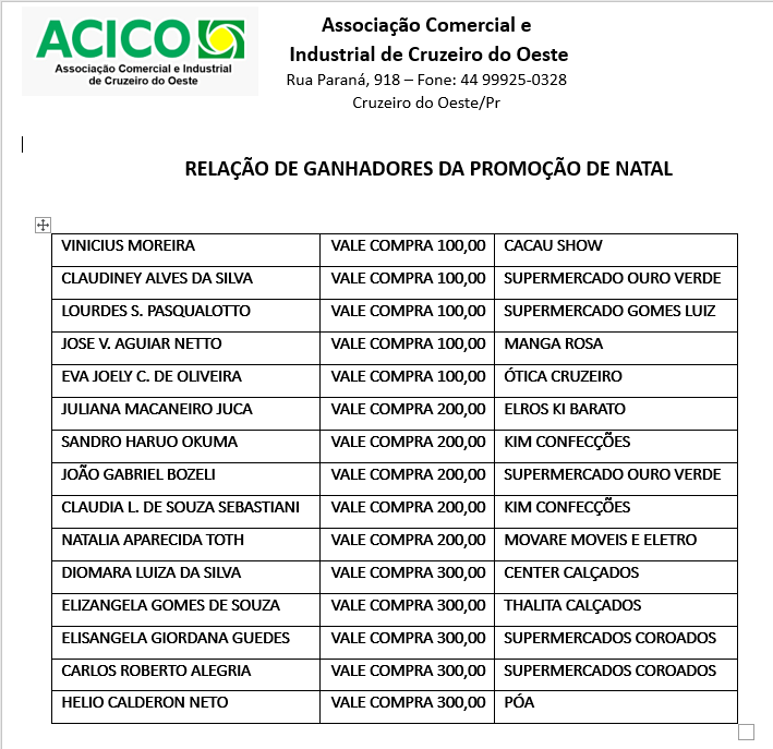 ACICO Ganhadores da Promoção de Natal 2023 Ganhadores do segundo sorteio da Promoção de Natal 2023 Postado em 12/01/2024 às 11:16 | Atualizado em 12/01/2024 às 11:22 Ganhadores da Promoção de Natal 2023 Postado em 12/01/2024 às 11:16 | Atualizado em 12/01/2024 às 11:22