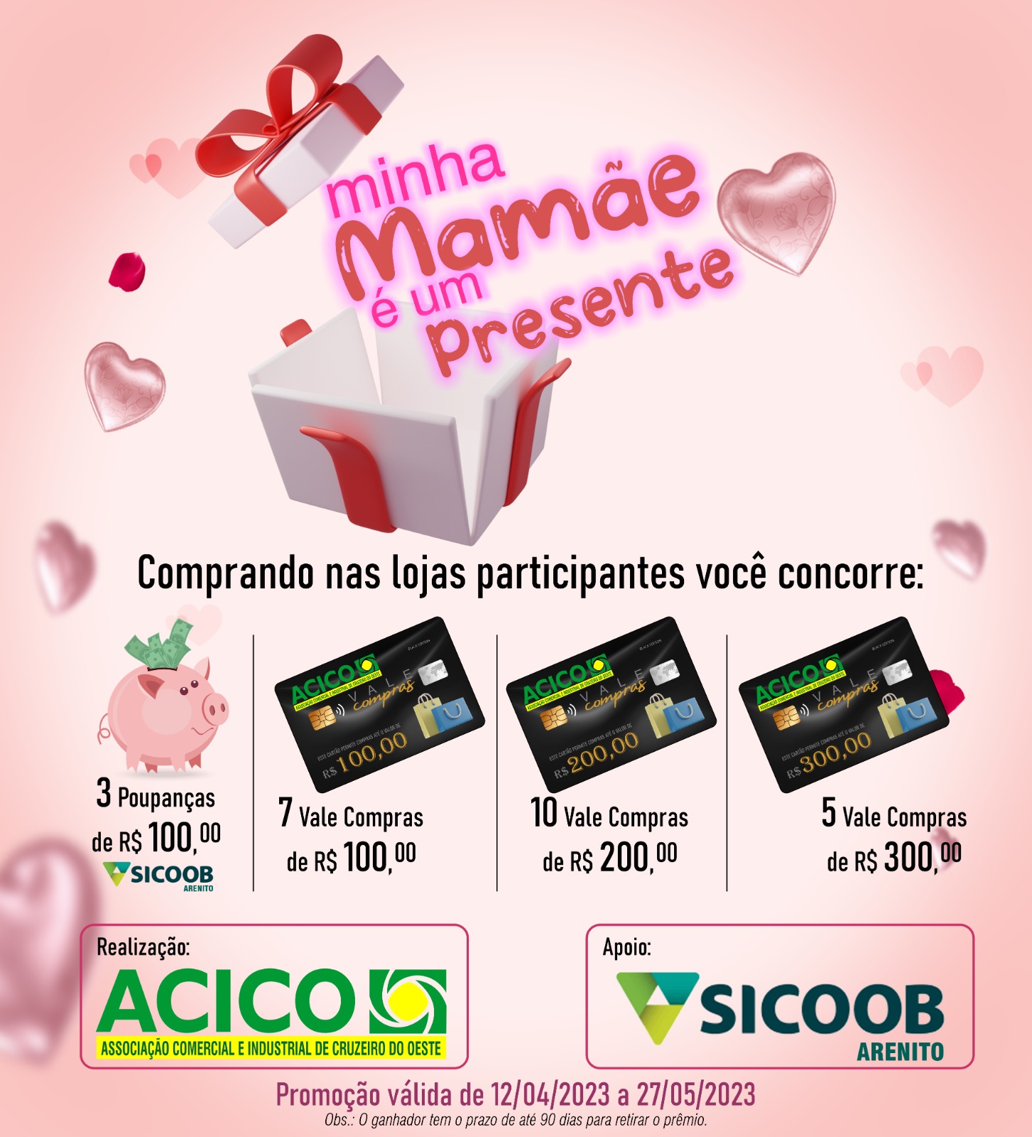 E hoje começa nossa promoção do dia das mães: "Minha mamãe é um presente". Serão sorteados 3 poupanças e 22 vales compras. Agradecemos as lojas participantes pela parceria e por acreditarem no nosso trabalho. Empresas participantes da promoção: Agrotop Rações; Alternativa Modas; Amora Concept; Anjo Luz Modas; Arcanjo Livraria; Arco-Iris Modas; Bazar São Lucas; Brandani Confecções; Branlar Móveis; Center Calçados; Depósito Antunes; Dri Modas; Elros Ki Barato; Gráfica Pim; Ibiza Calçados; Karol Tintas; Kim Confecções; Manga Rosa; Milly Confecções; Movare Móveis; O Boticário; Ótica Cruzeiro; Óticas LZ; POÁ Concept; Rainha dos Calçados; Suam Modas; Supermercado Gomes Luiz; Supermercado Coroados; Supermercado D'talia; Supermercado Ouro Verde; Thalita Calçados e Zilu Modas.